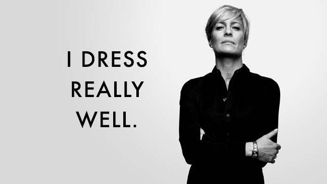 Even if you don’t like the politics theme of House of Cards, one thing I think most people can appreciate is the on-point fashion and presentation of the show, more specifically Claire’s character. This lady can dress. When you think First Lady or VP candidate, Claire’s image definitely fits the bill as she is always dressed to the nines.