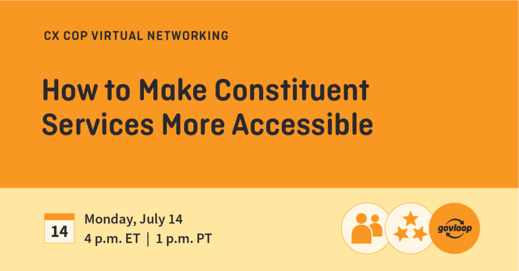 Join us online Monday, July 14, from 4-4:30 pm. ET/1-1:30 p.m. PT to learn how to identify and address common challenges when it comes to accessibility in constituent services with Michelle Pinsky, UX Designer, Virginia Information Technologies Agency.
