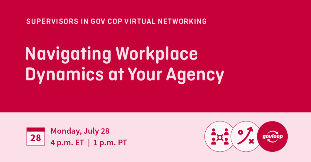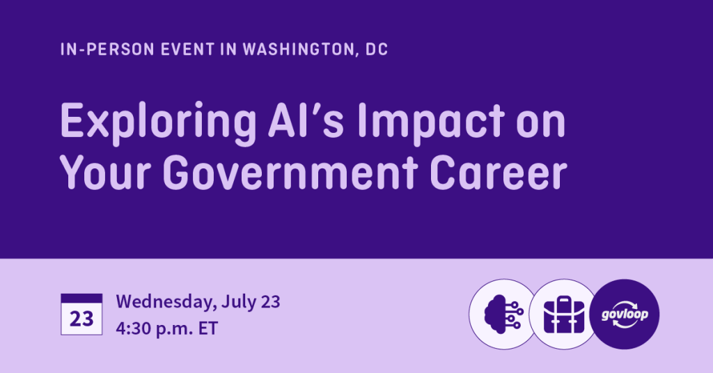 We invite you to join your public-sector peers in person on Wednesday, July 23, at 4:30 p.m. ET at the GovLoop Office in Washington, D.C., for a networking discussion on the impact of AI on government careers.
