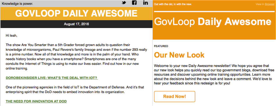 If you’re familiar with GovLoop, then you’re probably also familiar with our daily newsletter, the Daily Awesome. This newsletter has been a mainstay of GovLoop’s emails, and we put a lot of time and thought into packing it with the best gov content each day for our community (if by chance you don’t get the Daily Awesome, sign up here).