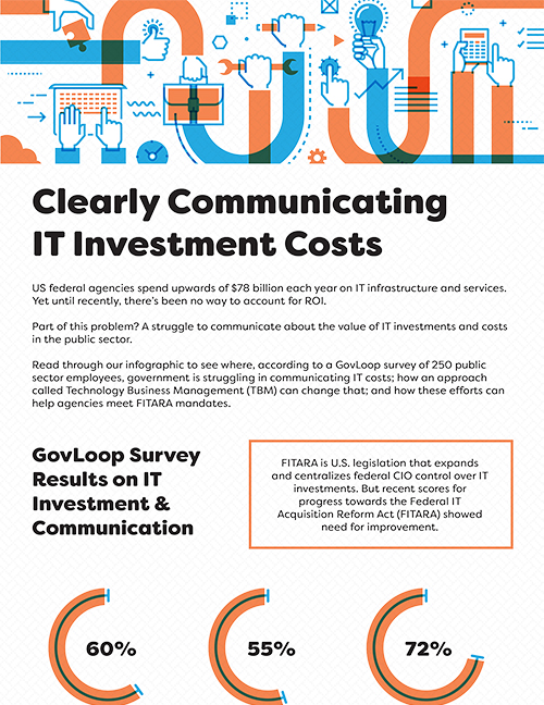 Read through our infographic to see where, according to a GovLoop survey of 250 public sector employees, government is struggling in communicating IT costs; how an approach called Technology Business Management (TBM) can change that; and how these efforts can help agencies meet FITARA mandates.