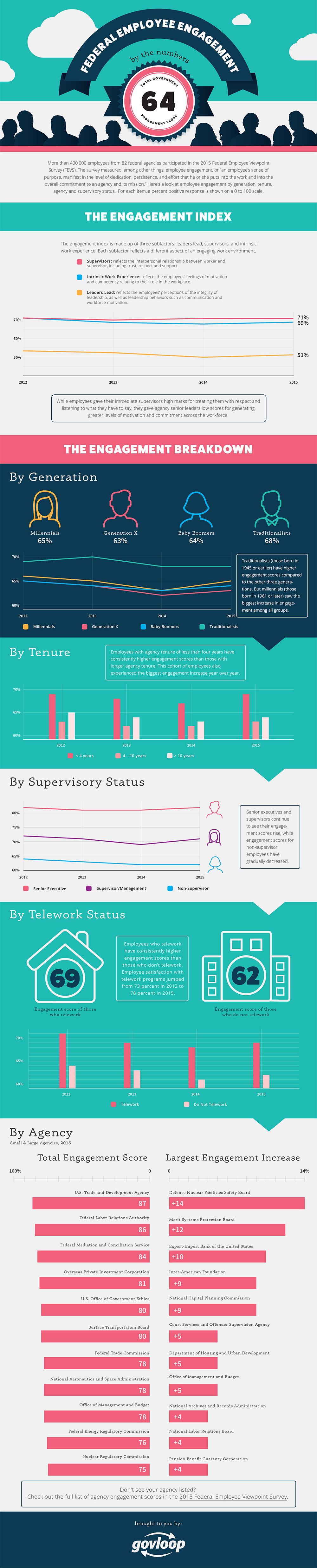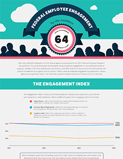 More than 400,000 employees from 82 federal agencies participated in the 2015 Federal Employee Viewpoint Survey (FEVS). The survey measured, among other things, employee engagement, or “an employee’s sense of purpose, manifest in the level of dedication, persistence, and effort that he or she puts into the work and into the overall commitment to an agency and its mission.” Here’s a look at employee engagement by generation, tenure, agency and supervisory status.