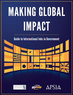 Until now, there has been no single resource that pulled together all of the information about globally-oriented government jobs into one concise package. With this “Guide to International Jobs in Government,” RFFG, GovLoop, and APSIA have consolidated information from dozens of websites and interviews with more than 20 international government employees and career experts.
