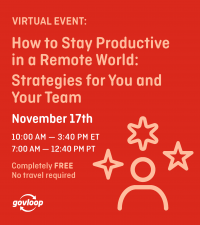 Join us online on Wednesday, Nov. 17 from 10 a.m.-3:40 p.m. ET/7 a.m.-12:40 p.m PT. to learn from government and industry experts how to empower the government workforce with the right tools, strategies and policies to make remote work for you, your team and the public.